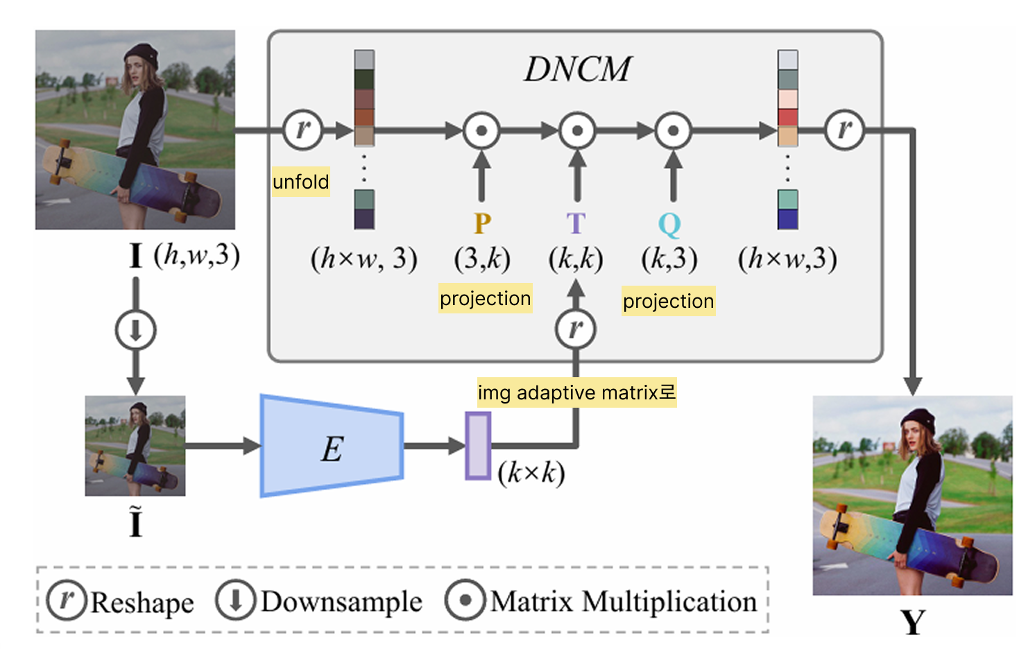 - CNN이 “필터/LUT 파라미터”가 아니라 DNCM의 변환 행렬 파라미터를 학습 +